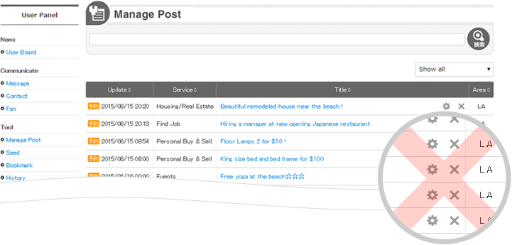 You can delete the information or data you listed on Vivinavi from "Manage Post." Please follow the directions below for more details. The information or data you listed may be copied and listed on other websites without your permission. Just because you deleted it from Vivinavi, it doesn't mean that you deleted it completely from Internet. Please do not list any information or data that you don't want others to know or make others feel bad before thinking about it carefully. If you have any questions about deleting data, feel free to contact us here.